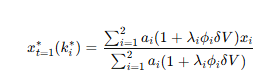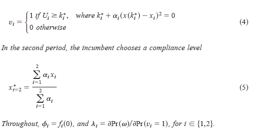 이 식은 정부가 1기(재선 가능 시기)에 선택하는 최적의 준수 수준을 보여준다. 정부의 실제 준수 수준은 각 집단이 원하는 준수 수준(xi)의 가중평균으로 결정된다. 단, 그 가중치는 단순한 집단의 선호 강도(ai)만이 아니라, 집단의 선거적 영향력(λi), 정보력(ϕi), 그리고 정부가 재선을 얼마나 중시하는지(δV)까지 반영된다.