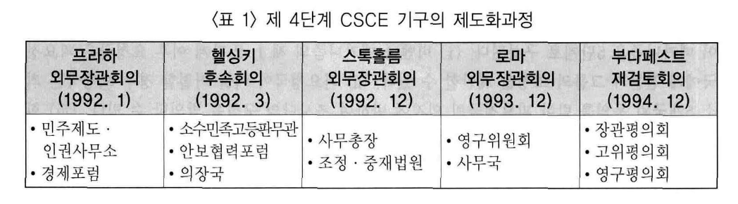 제4단계 (1991-1994, 전환) 1994년 마침내 ‘프로세스’에서 ‘국제기구’로의 레짐 전환이 이루어졌다. 이 당시 유럽에서는 전통적 의미의 군사적 위협은 사라지고 주로 국내 또는 지역적 수준에서의 비군사적 갈등이 주요 안보 위협으로 등장했다.